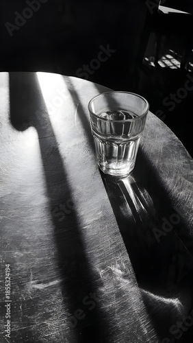 Minimalist Glass of Water on Table with Dramatic Sunlight and Shadow Play