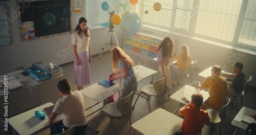Female Teacher Finishing Lesson, Saying Goodbye to Group of Diverse Kids at the End of School Day. Happy Primary School Children Packing Their Backpacks and Leaving School for Holidays. High Angle.