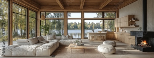 Spacious lakefront living room with natural light and warmth