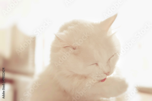 Gato branco lavando sua pata direita
