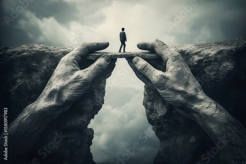 A lone man walks a narrow path between two giant hands.