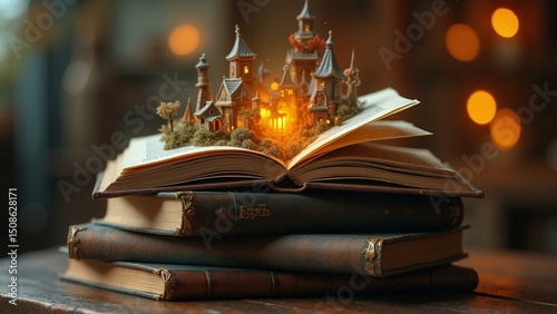 Vintage books with a glowing open book displaying a miniature fantasy world – warm, cozy, and magically detailed., ultra detailed, 8k resolution, HDR, professional