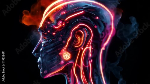 Female android with glowing circuits and wiring suffers from overheating, releasing smoke from her head. The scene captures a moment of technological malfunction and danger