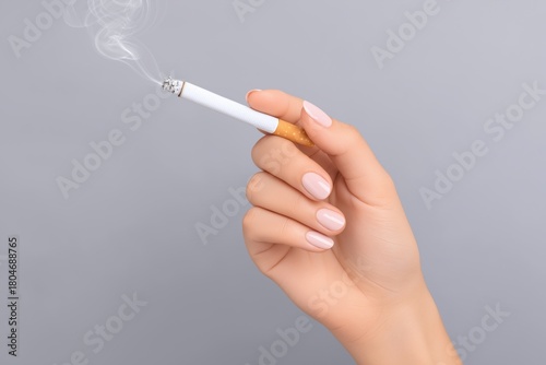 Elegant female hand with manicured nails holding a cigarette, wisps of smoke rising against a soft gray background, conveying a sense of relaxation and contemplation