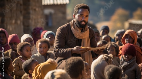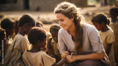 Missionary Compassion: A missionary providing care and support to children in an underprivileged area, reflecting the selfless giving and love that many Christians bring to global