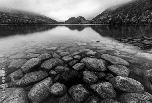 Black and White image of Jordan Pond and the Bubbles, Acadia, Maine