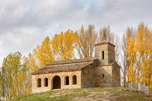 Mozarabic hermitage of Santa Cecilia of the ninth century in Barriosuso, Burgos, Castile and Leon, Spain. Behind trees in autumn with yellow tones