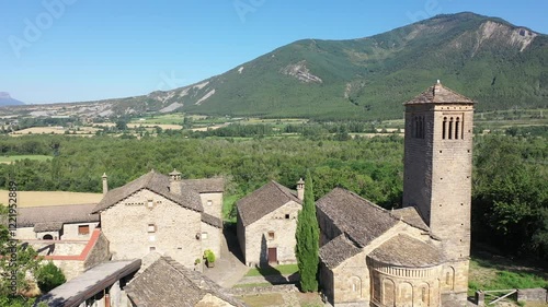 Aerial view of bell tower and apse of the Mozarab Pre-Romanesque or Romanesque Church of San Pedro de Larrede in the Serrablo Region. Aragon. Spain. High quality 4k footage