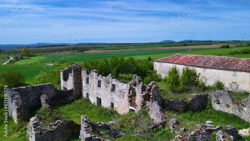 Ruins of the abandoned town of Lorilla in the Páramos region. Aerial view from a drone. Burgos. Spain. Europe