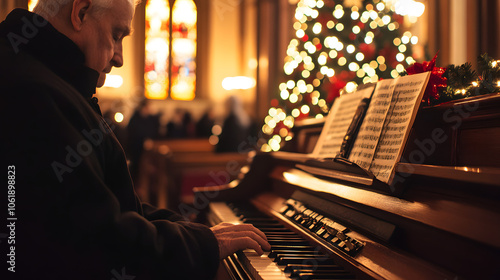 An organist playing Christmas hymns as parishioners arrive for a Christmas Day church service.