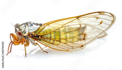 Close up shot of a cicada bug on a white surface, its wings outspread and translucent, head to the left