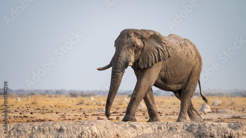 A huge pachyderm elephant, with its large trunk and tusks, is isolated in the sunny wild nature of the desert sky