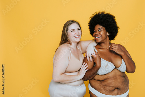 Cropped portrait plus size woman. Beautiful curvy body, seductive lady posing In underwear. Attractive oversized female In lingerie standing on dark blue studio background.