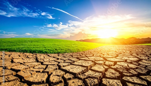 Split landscape showing barren cracked earth and lush green field under scenic sky, symbolizing climate contrast
