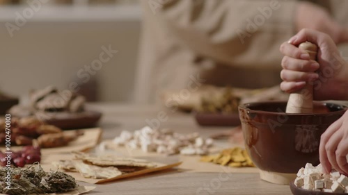 The Oriental Medicine room setting with a table filled with herbs features a herbalist pounding angelica sinensis while a herbalist in beige clothes rearranges the wrapped herbal medicine packets.