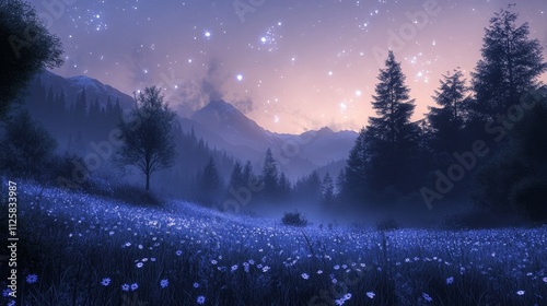 A tranquil pre-dawn landscape under a fading starlit sky, with slender trees and wildflowers bathed in ethereal light, evoking serenity, quiet anticipation, and the promise of new beginnings.