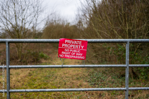 A sign for private property keep out on a metal gate with coiled barbed wire to farmland field
