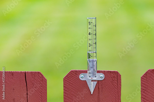 Rain gauge weather station or garden rain monitoring device. Instrument for measuring the amount of rainfall.
