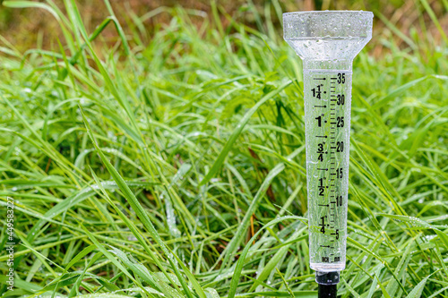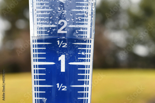 A rain gauge showing rainfall totals after a rainstorm, raining