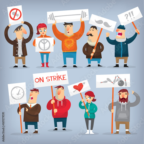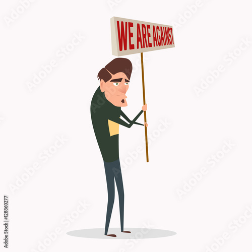 Angry cop breaking a timid snowman holding a sun poster, vector cartoon illustration isolated on a white background