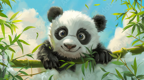 Peaceful panda nestled atop a cloud bamboo forest paradise below under a soft pastel sky