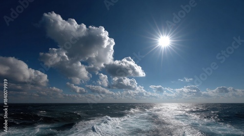 Radiant sun illuminates the azure sea and voluminous clouds, invoking Marine Day's reverie and Oceanic Tranquility Festival