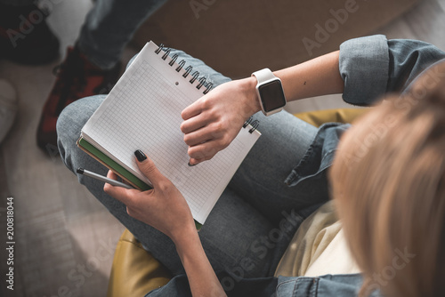 Top view close up of young woman sitting on beanbag with scratchpad and pencil on her knees. She is checking time on smartwatch