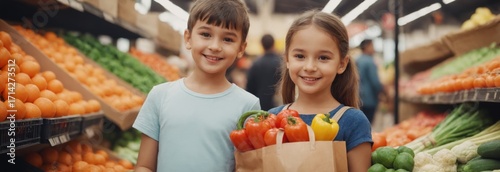 Boy and girl buying vegetables and fruits in the supermarket. Healthy eating concept.