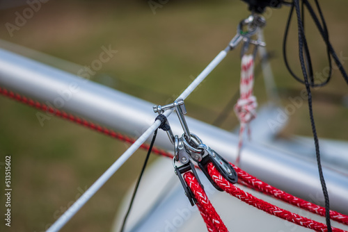 Set of isolated ropes with different knot types. Nautical thread or cord with sheet bend and overhand, granny and figure eight, square or reef knot. Two ropes knotted or whipcord intertwined. Marine