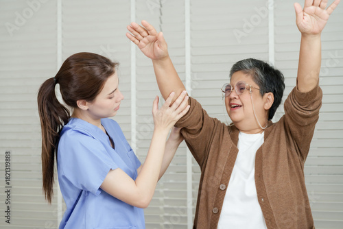 Asian female physiotherapist assisting senior woman with both arms raised in shoulder mobility routine for rehabilitation therapy aiming to restore joint range and reduce stiffness