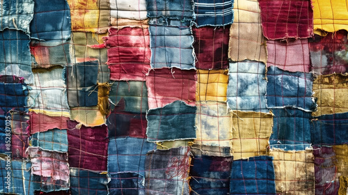 Close-up of a colorful patchwork quilt made from a variety of fabric squares with frayed edges, stitched together in a grid pattern.