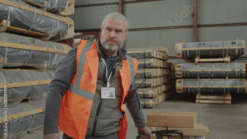 Medium shot of storeman pulling cart loaded with cargo during workday at big warehouse