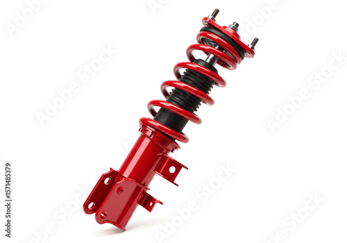 A red car suspension strut with spring and shock absorber on a white background in studio lighting