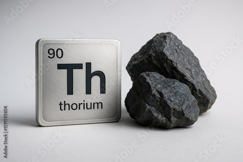Thorium Element Display with Dark Gray Rocks showcases the periodic table element alongside rough, natural mineral samples, perfect for science education and industrial exploration.