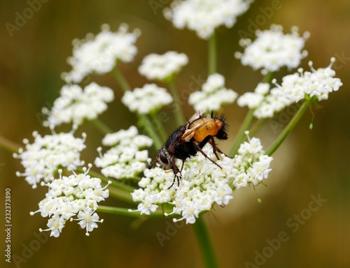Tachina fera (Tachina fera) on umbelliferous blossom, Germany, Europe