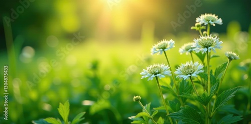 Field of umbelliferous hogweed with sunlight filtering through the plants' leaves, filtered light, greenery