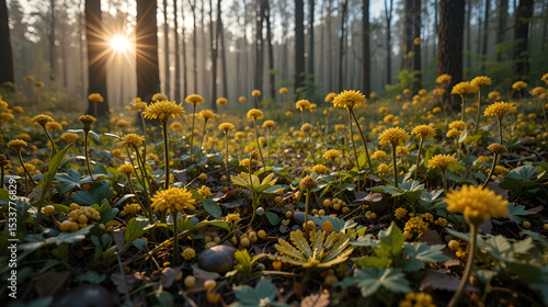 Golden seeds scattered on the forest floor at dawn, umbelliferous, hogweed, forest