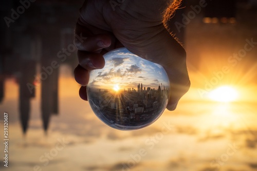 Upside down photo of a caucasian woman in white shirt and jeans smiling on a yellow studio wall with free space