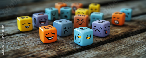 Simple, flat cubes with varied emotions, scattered randomly on a wooden surface, focusing on a clean, modern illustration style