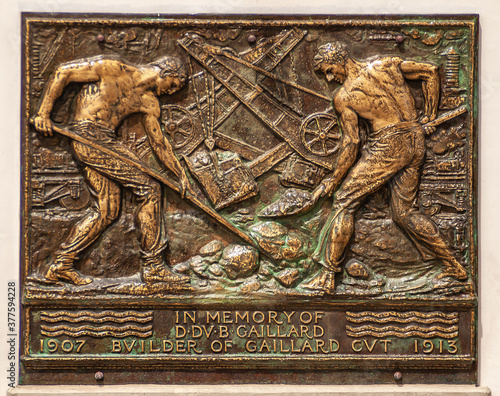City of Knowledge, Panama - November 30, 2008: Brown-golden memorial plate for dead engineer, builder of Miraflores locks, the canal and more. Image of hand laborers digging, outside Visitor Center.