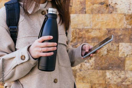 Crop anonymous female in warm coat with backpack holding reusable water bottle and browsing modern mobile phone against building wall on street