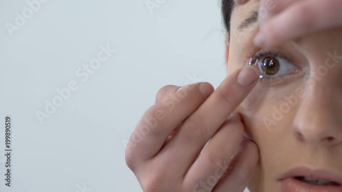 Young woman putting contact lens in her eye close up
