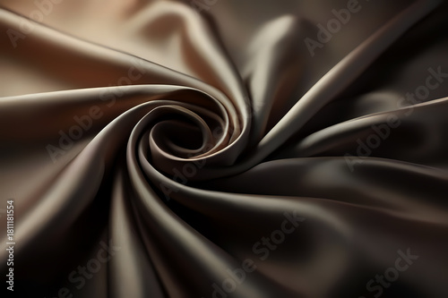 Background with soft, swirling satin folds. Rich texture of luxurious weightless draped crumpled fabric. Abstract composition in deep cocoa, gray taupe and smoky beige tones, with gentle highlights.