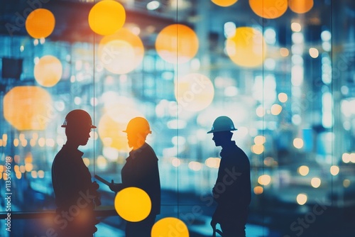 Silhouetted engineers and construction team collaborating at worksite with blurred background