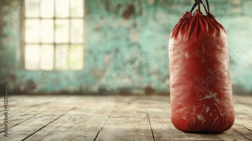 A worn-out red boxing bag stands alone in a vintage gym, symbolizing dedication and the enduring spirit of fitness amidst an atmosphere of hard work and perseverance.
