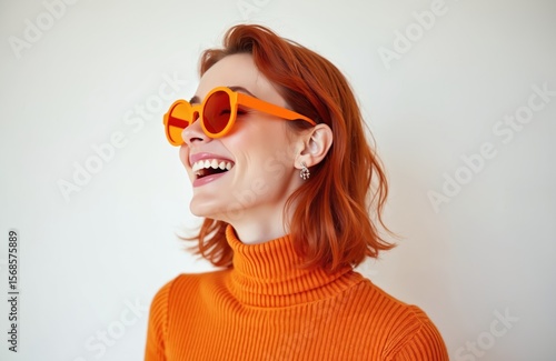 Happy redhead woman wears vibrant orange sunglasses, turtleneck sweater. She laughs heartily, exuding carefree joy, summer style. Her modern, trendy outfit, confident personality shine through.