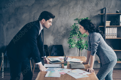 Photo of two partners seriously looking eyes competitive report standing near table workshop table