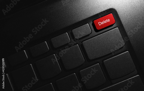 Red delete key button. Keyboard laptop in the dark. Abstract business concept background.