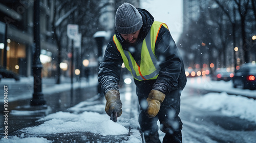 A diligent city worker dressed in a thick winter coat and reflective vest, wearing insulated gloves, carefully spreads salt onto a frosty, ice-covered sidewalk under the pale light