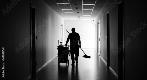 Silhouette of dedicated cleaner pushing cart with supplies down sterile office hallway, emphasizing diligent work and hygiene